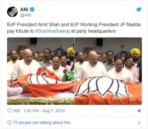 पूर्व विदेश मंत्री सुषमा स्वराज का पार्थिव शरीर अंतिम दर्शन के लिए भाजपा मुख्यालय पहुंच गया है। जहां उनको श्रद्धांजलि देने के लिए लोगों का तांता लगा हुआ है। शाम तीन बजे के बाद उनका अंतिम संस्कार लोधी रोड स्थित श्मशान घाट पर किया गया जाएगा।भाजपा अध्यक्ष अमित शाह और कार्यकारी अध्यक्ष जेपी नड्डा ने पार्टी मुख्यालय में सुषमा स्वराज के पार्थिव शरीर पर श्रद्धा सुमन अर्पित किया और उनके पार्थिव शरीर को पार्टी का झंडे में लपेटा गया।