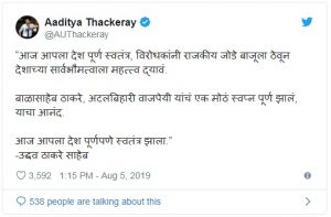 अनुच्छेद 370 हटाने के प्रस्ताव पर बोले उद्धव ठाकरे- आज हमारा देश पूरी तरह से स्वतंत्र, बाला साहेब और वाजपेयी का सपना हुआ पूरा…..