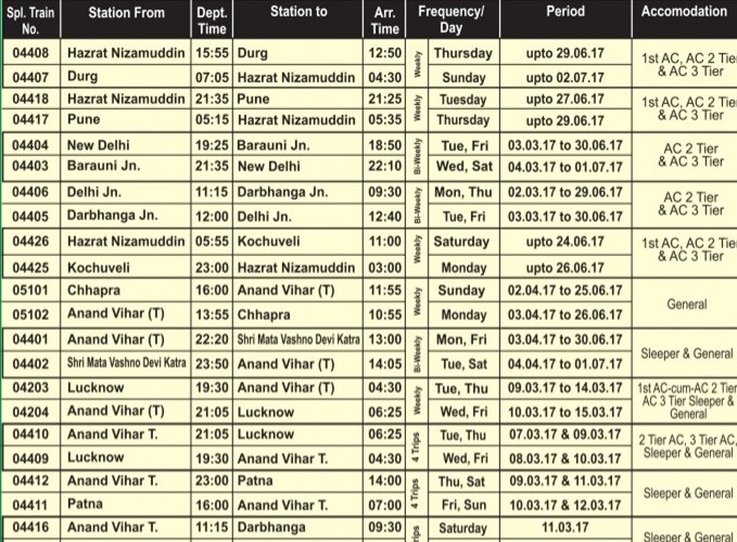 इनमें फिरोजपुर कैंट-कटिहार स्पेशल गाड़ी, 4408 हजरत निजामुद्दीन से दुर्ग, 4418 हजरत निजामुद्दीन से पुणे, 4404 नई दिल्ली-बरौनी जंक्शन, 4426 हजरत निजामुद्दीन-कोच्चुवेली, 4401 आनंद विहार-श्री माता वैष्नो देवी कटरा, 4410 आनंद विहार-लखनऊ, 4412 आनंद विहार-पटना, 9726 दिल्ली सराय रोहिल्ला-जयपुर, 9628 दिल्ली कैंट-अजमेर, 4735 बीकानेर (दिल्ली जंक्शन से होते हुए)- हरिद्वार, 1171 मुंबई सीएसटी (दिल्ली जंक्शन से होते हुए)- जम्मू तावी, 82504 आनंद विहार (टी)-कामाख्या, जैसी स्पेशल ट्रेने चलाई जाएंगी। ये ट्रेने रिवर्स रूट पर भी चलाई जाएंगी यानी (जोड़ी) गाड़ियां हैं। वहीं ज्यादा जानकारी के लिए आप नीचे दिए गए चार्ट को भी देख सकते हैं या फिर enquiry.indianrail.gov.in पर जा सकते हैं।