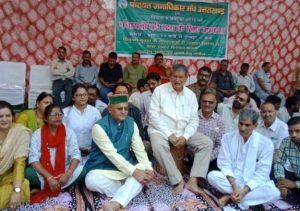 देहरादून- कल ही अस्पताल से डिस्चार्ज हुए पूर्व मुख्यमंत्री हरीश रावत आज एक दिवसीय धरने पर बैठ गये। हरीश रावत ने राजीव गांधी काम्प्लेक्स में आज एक दिवसीय उपवास व धरने पर बैठे है।। इस दौरान उनके साथ पूर्व कांग्रेस अध्य्क्ष किशोर उपाध्याय, प्रदेश उपाध्यक्ष जोत सिंह बिष्ट समेत कई कांग्रेसी नेता भी धरना दे रहे हैं। हरीश रावत पंचायत जनाधिकार मंच के बैनर तले पंचायतों की रक्षा के लिये धरना और उपवास पर बैठे हैं।