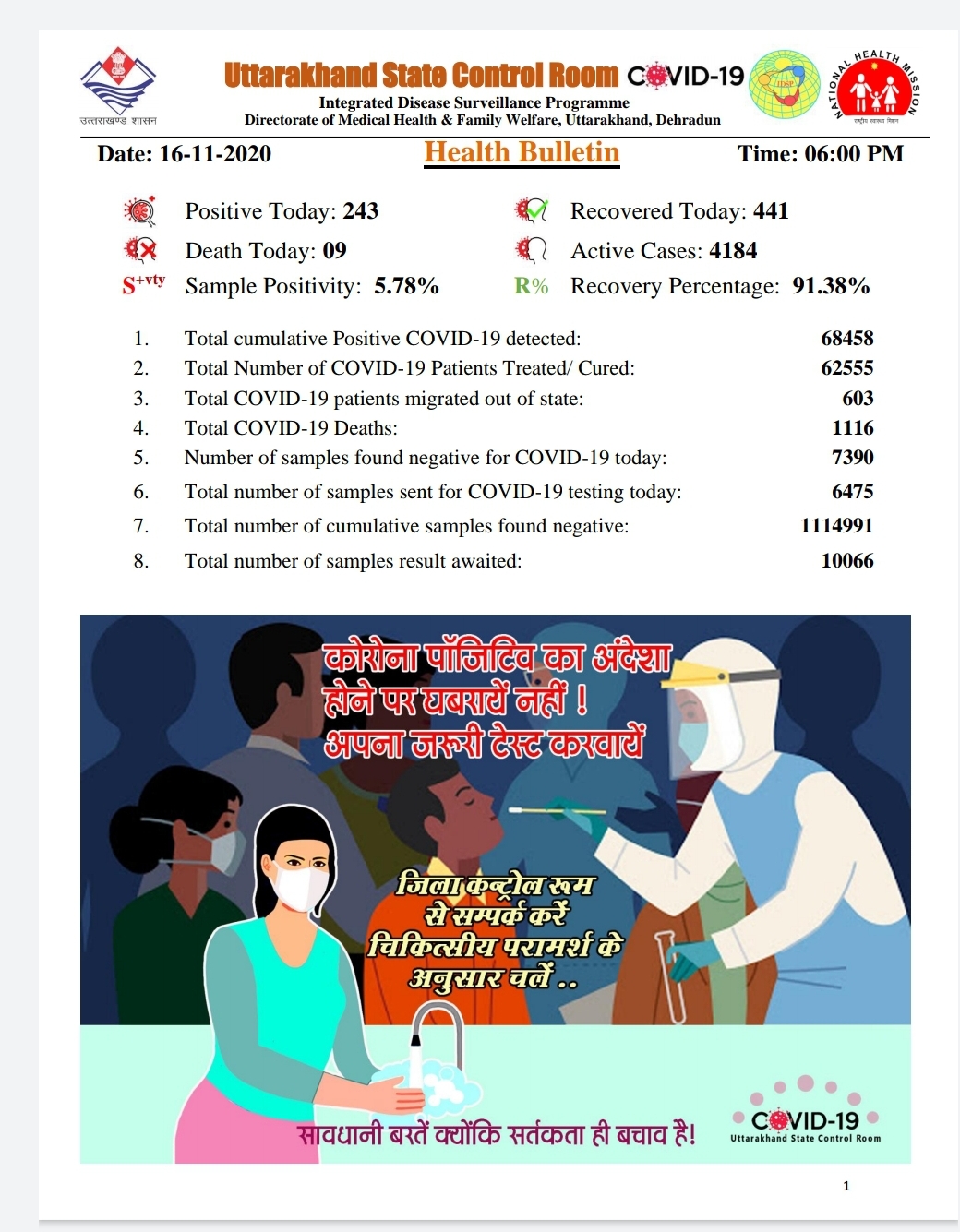 देहरादून। उत्तराखंड में सोमवार को कोरोना के 243 पॉजिटिव केस रिपोर्ट हुए हैं, जबकि 9 लोगों की मौत संक्रमण से हुई है। प्रदेश में कुल 4148 एक्टिव केस हैं, जबकि रिकवरी रेट 91.38 परसेंट है।