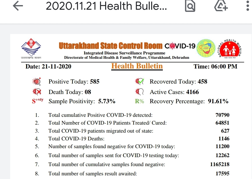 देहरादून। शनिवार को उत्तराखंड में एक बार फिर कोरोना के 500 से अधिक नए मामले सामने आने के बाद संक्रमितों की संख्या बढकर 70,790 हो गई है। वहीं बीते 24 घंटे में 8 संक्रमितों की मौत होने की सूचना है। हालांकि आज पहचान में आए 585 कोरोना रोगिय़ों में से 458 संक्रमित स्वस्थ हुए और अब तक 64,851लोग संक्रमण मुक्त होकर स्वस्थ हो चुके है और एक्टिव केस 4166 व संक्रमितों के स्वस्थ होने की दर 91.61% हैं। स्वास्थ्य विभाग की टीम संक्रमितों के इलाज में जुटी है।