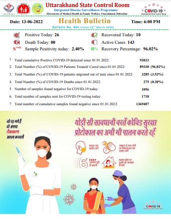देहरादून – उत्तराखंड में आज कोरोना के 26 नए मामले मिले है।