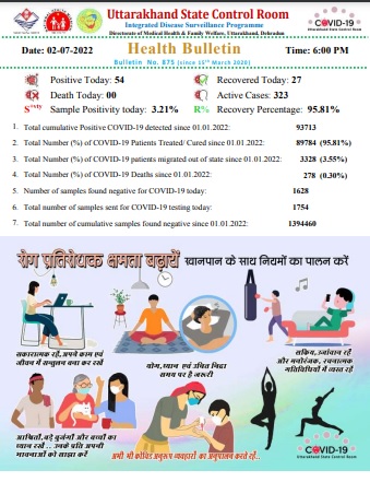 देहरादून – उत्तराखंड में आज कोरोना के 54 नए मामले मिले है।