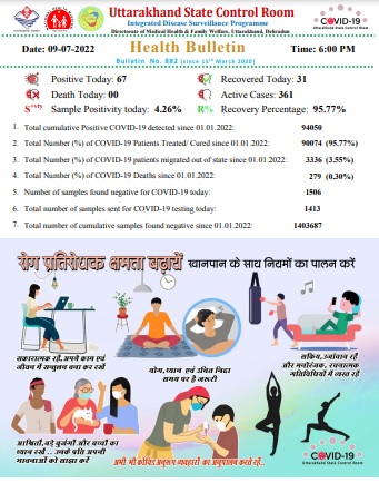 देहरादून – उत्तराखंड में आज कोरोना के 67 नए मामले मिले है।