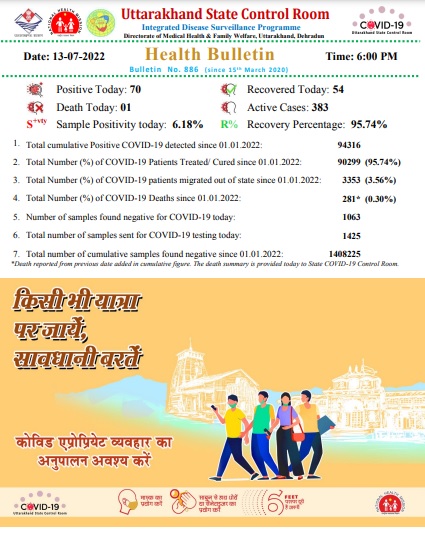 जिसमें अल्मोड़ा में 1, देहरादून में 54, हरिद्वार में 4, नैनीताल में 5, टिहरी गढ़वाल में 1, उधम सिंह नगर में 5 मामले मिले है।