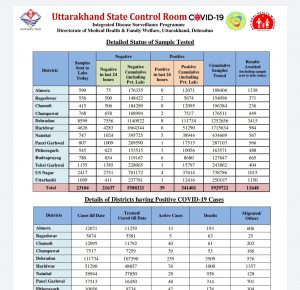 उत्तराखंड में आज कोरोना वायरस के 39 पॉजिटिव मरीज पाए गए, पिछले 24 घंटे में 01 की मृत्यु हुई. देहरादून में 08 नए मरीज आये सामने.