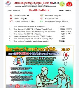 उत्तराखंड में आज कोरोना वायरस के 39 पॉजिटिव मरीज पाए गए, पिछले 24 घंटे में 01 की मृत्यु हुई. देहरादून में 08 नए मरीज आये सामने.