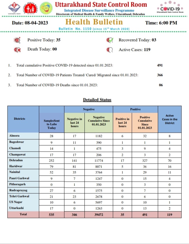 देहरादून – उत्तराखंड में आज कोरोना के 35 नए मामले मिले है।