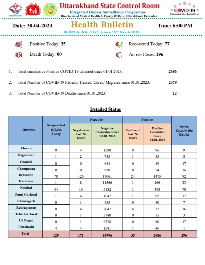 जिसमें बागेश्वर में 1, देहरादून 24, हरिद्वार 1, नैनीताल 1, पौड़ी 1, रुद्रप्रयाग 6 और उत्तरकाशी 1 नए मामले मिले है।