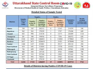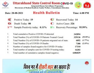 देहरादून- आज उत्तराखंड में कोरोना के 19 नए मामले सामने आये। वहीं पिछले 24 घंटे में कोरोना से कोई मौत नही हुई। देहरादून मे 06, पिथौरागढ़ में 01, नैनीताल में 03, रुद्रप्रयाग में 02, पौड़ी गढ़वाल में 02, हरिद्वार में 03, ऊधमसिंह नगर में 01 पॉजिटिव मरीज सामने आये.