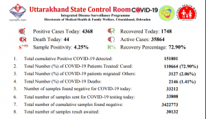 उत्तराखंड में आज कोरोना संक्रमितों का आकंडा चार हजार के पार पहुंचा है। स्वास्थ्य विभाग की तरफ से जारी किए गए हेल्थ बुलेटिन के मुताबिक आज सूबे में कोरोना के 4368 नए केस मिलें, तो वहीं 44 लोग कोरोना से जिंदगी की जंग हार गए। सूबे में एक्टिव कोरोना मरीजों की संख्या 35864है तो वहीं आज 1748लोगों ने आज कोरोना को मात देकर स्वस्थ हुए हैं। आज सबसे ज्यादा 1670पॉजिटिव केस देहरादून में मिले जबकि हरिद्वार में 1144, नैनीताल में 438 और ऊधम सिंह नगर में 200 और पौड़ी जिले में 390 कोरोना के नए केस मिले।