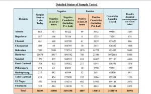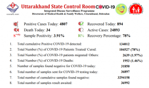 देहरादून-उत्तराखंड में कोरोना महामारी ने अभी तक के सभी रिकॉर्ड ध्वस्त कर दिए हैं। नए आकंडे डराने वाले हैं। स्वास्थ्य विभाग ने आज का हेल्थ बुलेटिन जारी कर दिया है। जिसके मुताबिक सूबे में आज कोरोना के 4807 नए मामले सामने आए हैं,तो वहीं 34 लोग कोरोना से जिंदगी की जंग हार गए। 894 कोरोना को मात देकर घर लौटे ।प्रदेश में कोरोना के 24893 एक्टिव मरीज मौजूद हैं।देहरादून में सबसे ज्यादा 1876 पॉजिटिव केस मिले तो वहीं नैनीताल 818 साथ के साथ दूसरे नम्बर पर तो वहीं हरिद्वार 786 पॉजिटिव केसों के साथ तीसरे नम्बर पर रहा ।