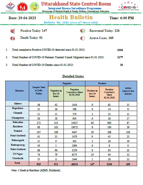 देहरादून – उत्तराखंड में आज कोरोना 147 नए मामले मिले है।