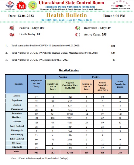 जिसमें अल्मोड़ा में 5, बागेश्वर में 2, चमोली में 3, चम्पावत में 2, देहरादून में 54, हरिद्वार में 6, नैनीताल में 23, पौड़ी गढ़वाल में 2, पिथौरागढ़ में 3, उधम सिंह नगर में 1 और उत्तरकाशी में 5 नए मामले मिले है।