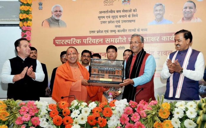 बुधवार को उत्तरप्रदेश के मुख्यमंत्री योगी आदित्यनाथ व उपमुख्यमंत्री केशव प्रसाद मोर्या और उत्तराखंड के मुख्यमंत्री त्रिवेंद्र सिंह रावत की मौजूदगी में प्रदेश के परिवहन मंत्रियों ने आपस में बस चलाने को लेकर ‘मेमोरंडम ऑफ अंडरस्टैंडिंग’ (एमओयू) साइन किया। मुख्यमंत्री के सरकारी आवास पर आयोजित कार्यक्रम में यूपी की ओर से परिवहन राज्यमंत्री (स्वतंत्र प्रभार) स्वतंत्रदेव सिंह व जम्मू-कश्मीर के परिवहन मंत्री सुनील कुमार शर्मा और उत्तराखंड के परिवहन मंत्री यशपाल आर्य ने एमओयू पर हस्ताक्षर किए।