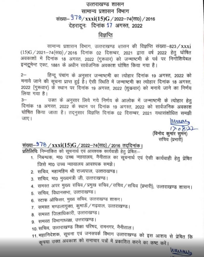 उत्तराखंड सरकार ने 19 अगस्त को जन्माष्टमी के अवसर पर जारी की छुट्टी।