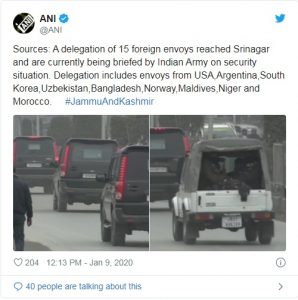 जम्मू-कश्मीर से विशेष राज्य का दर्जा वापस लेने के बाद भारत में अमेरिका के राजदूत केनेथ आई जस्टर समेत 16 देशों के राजनयिक मौजूदा स्थिति का मुआयना करने गुरुवार को श्रीनगर पहुंचे। अधिकारियों ने बताया कि दिल्ली में रहने वाले ये राजनयिक विशेष विमान में श्रीनगर के तकनीकी हवाई-अड्डे पर पहुंचे, जहां अधिकारियों ने उनका स्वागत किया। ये सभी राजनयिक दौरे के दौरान उपराज्यपाल जीसी मुर्मू और सिविल सोसायटी के सदस्यों से मुलाकात करेंगे। अमेरिका के अलावा प्रतिनिधिमंडल में बांग्लादेश, वियतनाम, नार्वे, मालदीव, दक्षिण कोरिया, मोरक्को, नाइजीरिया और अन्य देशों के राजनयिक भी शामिल होंगे। ब्राजील के राजदूत को भी राज्य के दौरे पर जाना था लेकिन दिल्ली में अपनी व्यस्तता के चलते उन्होंने अपना नाम वापस ले लिया।