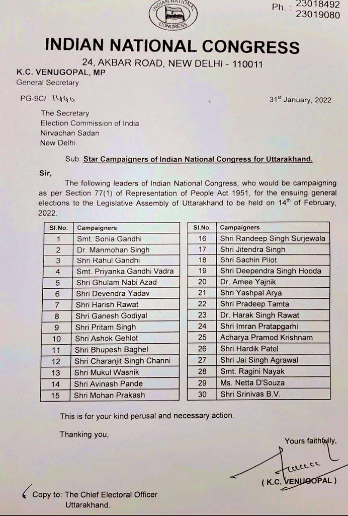 कांग्रेस ने राज्य में आगामी विधानसभा चुनाव के लिए अपने 30 स्टार प्रचारकों की सूची की जारी:-