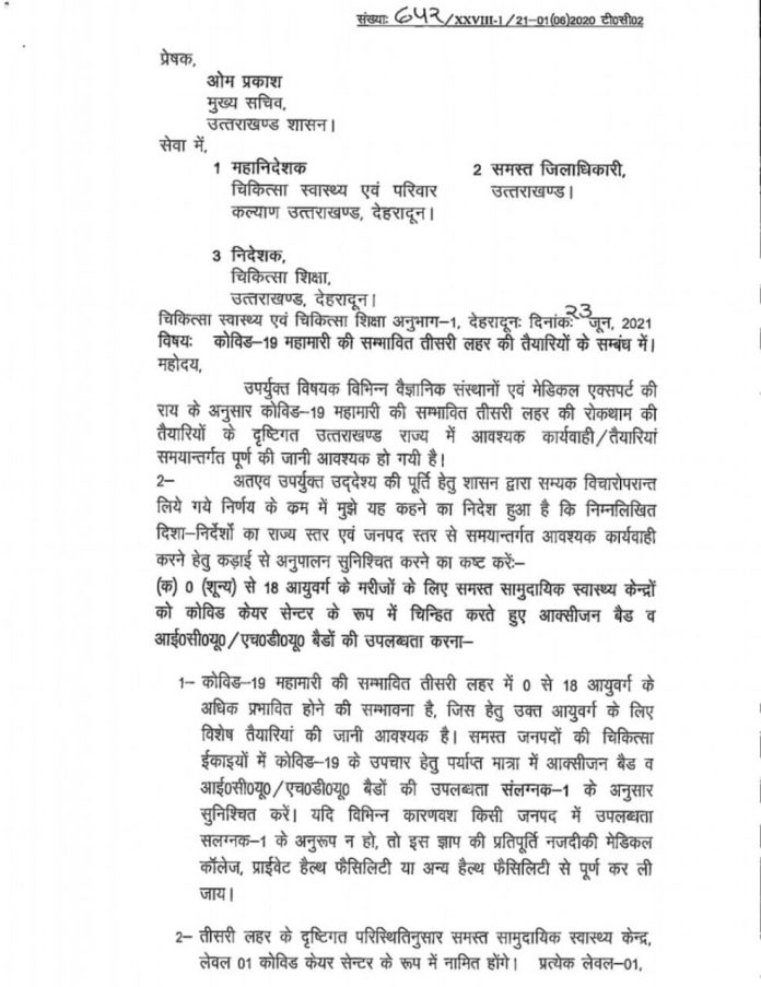 उत्तराखंड में कोरोना की संभावित तीसरी लहर को देखते हुए शासन स्तर पर अधिकारियों को तैयारियों के मद्देनजर दिशा-निर्देश जारी किए गए हैं। बच्चों की देखभाल के लिए पर्याप्त स्वास्थ्य सेंटर स्थापित करने के साथ ही वैज्ञानिक संस्थानों और मेडिकल एक्सपर्ट की राय के आधार पर तीसरी लहर की रोकथाम के लिए आवश्यक दिशा-निर्देश जारी हुए हैं। मुख्य सचिव ओमप्रकाश की ओर से जारी किए गए निर्देशों के क्रम में 18 साल की आयु वर्ग के मरीजों के लिए सभी सामुदायिक स्वास्थ्य केंद्रों को कोविड केयर सेंटर के रूप में चिन्हित करते हुए ऑक्सीजन बेड, आईसीयू, एचडीयू बेड की उपलब्धता सुनिश्चित करने के लिए कहा गया है। तीसरी लहर को देखते हुए सभी सामुदायिक स्वास्थ्य केंद्र लेवल वन में कोविड केयर सेंटर के रूप में नामित होंगे। जोकि 18 साल तक के बच्चे किसी और बीमारी से ग्रसित हो गए हैं उनकी भी लिस्ट तैयार करने के निर्देश दिए गए हैं। यही नही, तीसरी लहर के मद्देनजर कम से कम 1,000 लीटर प्रति मिनट, क्षमता वाले ऑक्सीजन स्टोरेज टैंक की व्यवस्था करने के लिए भी कहा गया है। साथ ही बाल रोग चिकित्सकों और स्टाफ नर्सों की उपलब्धता और प्रशिक्षण के भी दिशा-निर्देश दिए गए हैं।