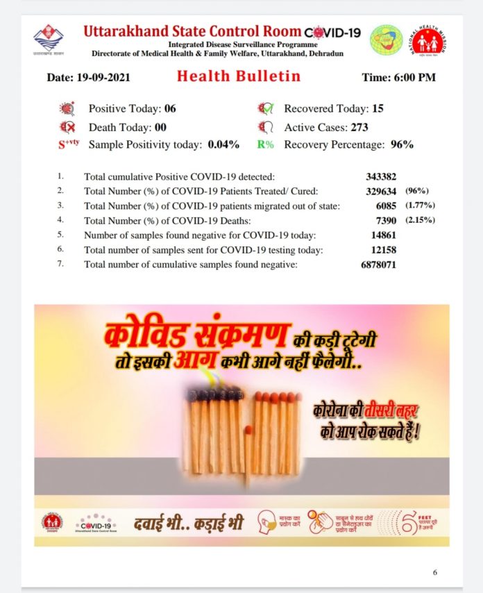 आज उत्तराखंड में कोरोना के (6) मामले सामने आये,कोरोना से मरने वालों की संख्या है 00