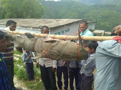 उत्तराखंड के अल्मोड़ा जिले में इनोलू गांव में रामगंगा नदी से पकड़ी गई ये विशालकाय मछली का नाम है गौछ जिसका वजन लगभग 125-130 किग्रा बताया जा रहा है । जब गांव के लोगो ने इसे पकड़ा तो वह लोगों का हुजूम उमड़ पड़ा। बडे बुजुर्गो का कहना है कि दुर्लभ प्रजाति की ऐसी मछली कभी-कभी ही देखने को मिलती है।