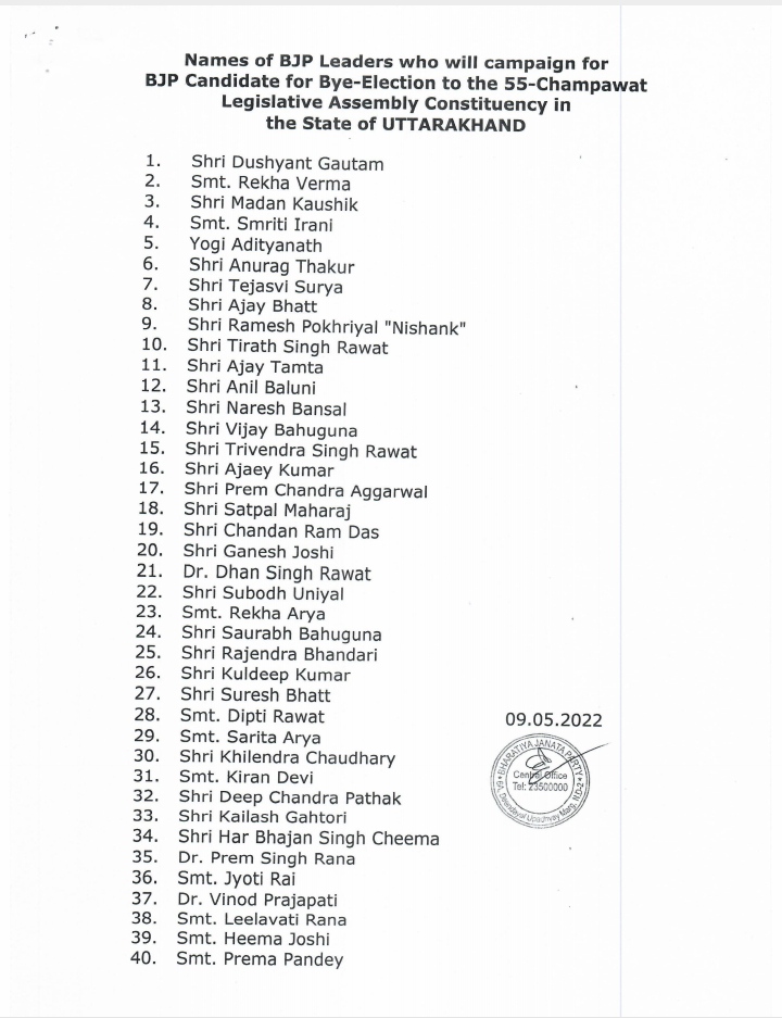 चम्पावत – चम्पावत उपचुनाव को लेकर भाजपा ने अपने स्टार परचारकों की सूची जारी कर दी है। भाजपा के प्रदेश मीडिया प्रभारी मनवीर सिंह चौहान ने यह सूचना देते हुए बताया कि पार्टी ने मंगलवार को अपने स्टार प्रचारकों की सूची जारी की है। भाजपा ने अपनी सूची में 40 स्टार प्रचारकों को शामिल किया है। मुख्यमंत्री पुष्कर सिंह धामी प्रचार करेंगे ये स्टार प्रचारक। स्टार प्रचारकों में उत्तर प्रदेश के मुख्यमंत्री योगी आदित्यनाथ और महिला एवं बाल विकास मंत्री स्मृति ईरानी जैसे दिग्गज नेता है।
