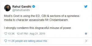 ‘श्री चिदंबरम की चारित्रिक हत्या के लिए मोदी सरकार ईडी, सीबीआई और एक रीढ़विहीन मीडिया वर्गों का इस्तेमाल कर रही है। मैं सत्ता के इस घृणित दुरुपयोग की कड़ी निंदा करता हूं’।