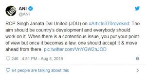 जम्मू-कश्मीर में अनुच्छेद 370 हटाने के फैसले का जनता दल यूनाइटेड (जदयू) के नेता आरसीपी सिंह ने समर्थन किया है। उन्होंने कहा, ‘लक्ष्य देश के विकास का होना चाहिए और सभी को इसे लेकर कार्य करना चाहिए। जब एक विवादास्पद मुद्दा होता है तब आप इस पर अपना पक्ष रख सकते हैं लेकिन एक बार जब यह कानून बन जाता है, सभी को इसे स्वीकार करना ताहि और आगे बढ़ना चाहिए।’ गौरतलब है कि मंगलवार को संसद ने संविधान के अनुच्छेद 370 के ज्यादातर प्रावधानों को खत्म करते हुए जम्मू-कश्मीर के विशेष दर्जे को खत्म कर दिया। इसके अलावा जम्मू-कश्मीर और लद्दाख को दो अलग-अलग केंद्र शासित क्षेत्र बनाने वाला विधेयक भी पारित हो गया है।