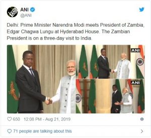 प्रधानमंत्री नरेंद्र मोदी ने हैदराबाद हाउस मे जाम्बिया के राष्ट्रपति एडगर छगवा लुंगू से मुलाकात की। जाम्बिया के राष्ट्रपति भारत की तीन दिवसीय यात्रा पर हैं। बुधवार सुबह जाम्बिया के राष्ट्रपति एडगर छगवा लुंगु को राष्ट्रपति भवन में गार्ड ऑफ ऑनर दिया गया। जिसके बाद उन्होंने राजघाट पर महात्मा गांधी को श्रद्धांजलि अर्पित की। जाम्बिया के राष्ट्रपति एडगर छगवा लुंगू से विदेश राज्य मंत्री और संसदीय मामलों के राज्य मंत्री वी मुरलीधरन ने मुलाकात की थी।