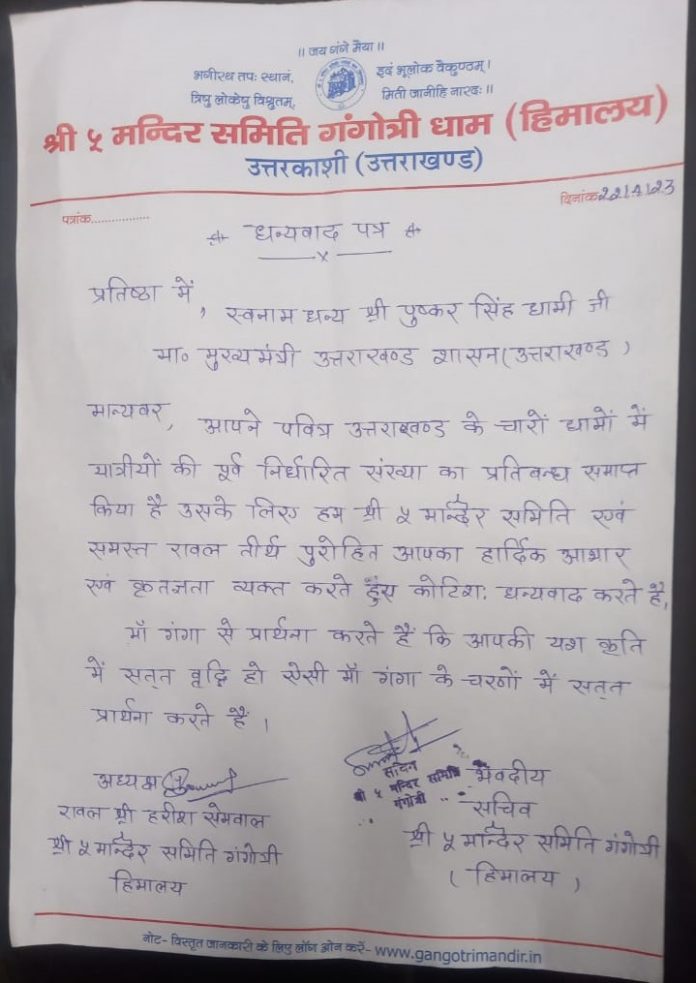 बाध्यता को समाप्त करने के बाद सिर्फ पुरोहित और चार धाम यात्रा रूटों पर कारोबारी काफी खुश नजर आ रहे हैं। फैसले को लेकर मुख्यमंत्री पुष्कर सिंह धामी का दिल से आभार भी व्यक्त कर रहे हैं। वही सिर्फ 5 मंदिर समिति गंगोत्री धाम ने पत्र लिखकर मुख्यमंत्री पुष्कर सिंह धामी का आभार व्यक्त किया है। समिति के अध्यक्ष हरीश सेमवाल ने पत्र लिखकर कहा कि जो निर्णय लिया गया है वह सराहनीय व योग्य है। कहा कि इससे समूचे तीर्थ पुरोहित और व्यापार मंडल बेहद खुश है। इस फैसले को देखते हुए समिति मां गंगा से प्रार्थना करती है कि आपकी यज्ञ कृति में सतत वृद्धि हो।