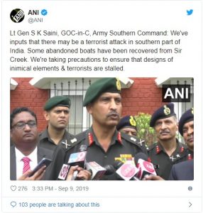 सेना के दक्षिणी कमान के जनरल ऑफिसर कमांडर-इन-चीफ लेफ्टिनेंट जनरल एसके सैनी ने कहा है कि उन्हें ऐसी जानकारी मिली है कि देश में आतंकी हमला हो सकता है। उन्होंने कहा, ‘हमें जानकारी मिली है कि दक्षिणी भारत में आतंकी हमला हो सकता है। सर क्रीक से कुछ नाव बरामद की गई हैं। आतंकी और विरोधी तत्व की हर मंशाह को नाकाम करने के लिए हम सावधानी बरत रहे हैं।’