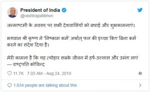 राष्ट्रपति ने ट्विटर पर लिखा, ‘जन्माष्टमी के अवसर पर सभी देशवासियों को बधाई और शुभकामनाएं। भगवान श्री कृष्ण ने ‘निष्काम कर्म’ अर्थात् फल की इच्छा किए बिना कर्म करने का संदेश दिया है। मेरी कामना है कि यह त्योहार सबके जीवन में हर्ष-उल्लास और उमंग लाएं।’