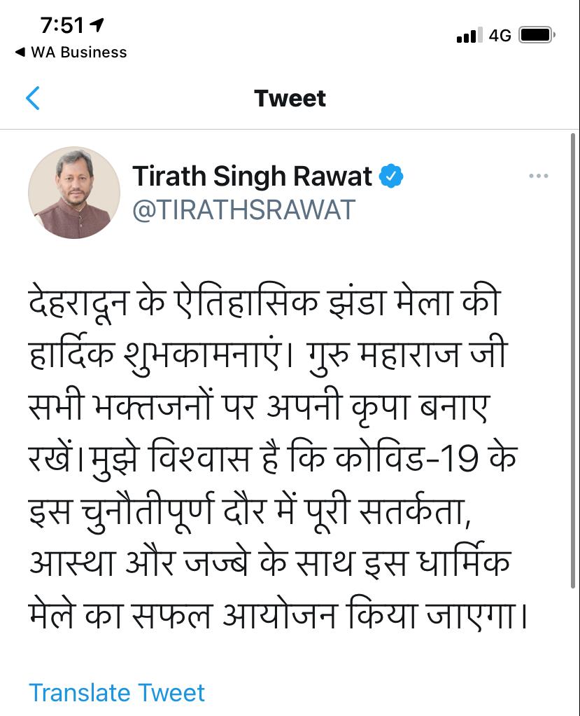 देहरादून- मुख्यमंत्री तीरथ सिंह रावत झंडे मेले की शुभकामनाएं दी,मुख्यमंत्री ने कहा सभी भक्त कोविड 19 के नियमो का पालन जज्बे के साथ मेले को सफल बनाएंगे.