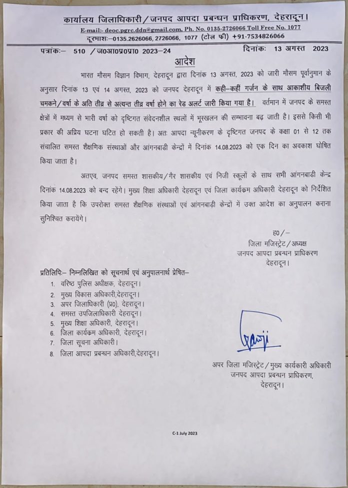 अतएव, जनपद समस्त शासकीय / गैर शासकीय एवं निजी स्कूलों के साथ सभी आंगनबाडी केन्द्र दिनांक 14.08.2023 को बन्द रहेंगे। मुख्य शिक्षा अधिकारी देहरादून एवं जिला कार्यक्रम अधिकारी देहरादून को निर्देशित किया जाता है कि उपरोक्त समस्त शैक्षणिक संस्थाओं एवं आंगनबाड़ी केन्द्रों में उक्त आदेश का अनुपालन कराना सुनिश्चित करायेंगे।