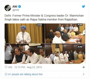 भारत के पूर्व प्रधानमंत्री मनमोहन सिंह ने शुक्रवार को राज्यसभा सदस्य के तौर पर शपथ ली। राज्यसभा के सभापति एम वेंकैया नायडू ने सिंह को उच्च सदन की सदस्यता की शपथ दिलाई। सभापति के कक्ष में सिंह को शपथ ग्रहण कराए जाने के दौरान सोनिया गांधी, राहुल गांधी, गुलाम नबी आजाद, अहमद पटेल और आनंद शर्मा समेत कांग्रेस के कई शीर्ष नेता मौजूद थे। इस दौरान राजस्थान के मुख्यमंत्री अशोक गहलोत और कुछ भाजपा नेता भी मौजूद थे। मनमोहन सिंह (86) राजस्थान से राज्यसभा के सदस्य पुन: चुने गए हैं। वह निर्विरोध चुने गए हैं क्योंकि भाजपा ने उनके खिलाफ कोई उम्मीदवार खड़ा नहीं किया था। मनमोहन सिंह का ऊपरी सदन में कार्यकाल इस साल 14 जून को समाप्त हो गया था जिसके बाद उनकी राज्यसभा में वापसी हुई है। इससे पहले उन्होंने राज्यसभा में लंबे समय तक असम का प्रतिनिधित्व किया था।