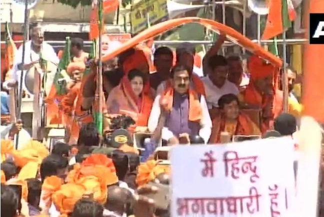 भोपाल में भाजपा उम्मीदवार प्रज्ञा ठाकुर के रोड शो में जमकर हंगामा मचा। यहां भाजपा कार्यकर्ताओं ने एसडीएम ऑफिस में एक एनसीपी कार्यकर्ता को जमकर पीटा। आरोप है कि इस कार्यकर्ता ने रोड शो के दौरान प्रज्ञा को काला झंडा दिखाया जिस पर भाजपा कार्यकर्ताओं ने उसे जमकर पीटा। भाजपा कार्यकर्ताओं के चंगुल से पुलिस ने इस शख्स को बचाया। भीड़भाड़ के बीच पुलिस किसी तरह इसे वहां से लेकर गई।