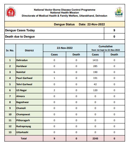 देहरादून – प्रदेश में आए 9 नए डेंगू के मरीज।