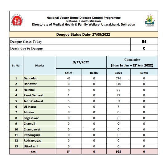 देहरादून – प्रदेश में आज आए डेंगू के 54 नए मरीज।
