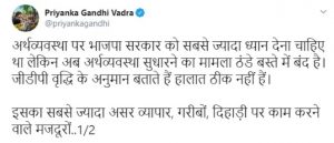 मौजूदा वित्त वर्ष में जीडीपी विकास दर के पांच फीसदी रहने के अनुमान को लेकर कांग्रेस महासचिव प्रियंका गांधी वाड्रा ने गुरूवार को केंद्र की नरेंद्र मोदी सरकार पर निशाना साधते हुए आरोप लगाया कि इस सरकार ने आर्थिक सुधार को ठंडे बस्ते में डाल दिया है। प्रियंका ने दावा भी किया कि अर्थव्यवस्था की स्थिति को ठीक करने के लिए सरकार की तरफ से कोई विश्वसनीय कदम नहीं उठाया जा रहा है। कांग्रेस नेता ने ट्वीट कर कहा कि अर्थव्यवस्था पर भाजपा सरकार को सबसे ज्यादा ध्यान देना चाहिए था लेकिन अब इसके सुधारने का मामला ठंडे बस्ते में बंद है। उन्होंने दावा किया कि जीडीपी वृद्धि दर के अनुमान बताते हैं कि हालात ठीक नहीं हैं और इसका सबसे ज्यादा असर व्यापार, गरीबों, दिहाड़ी पर काम करने वाले मजदूरों और रोजगार पर पड़ रहा है सरकार की तरफ से कोई भी भरोसे लायक कार्यवाही नहीं हो रही है।