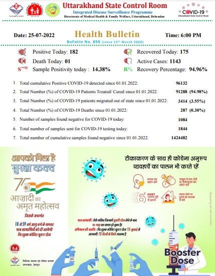 देहरादून – उत्तराखंड में आज कोरोना के 182 नए मामले मिले है।