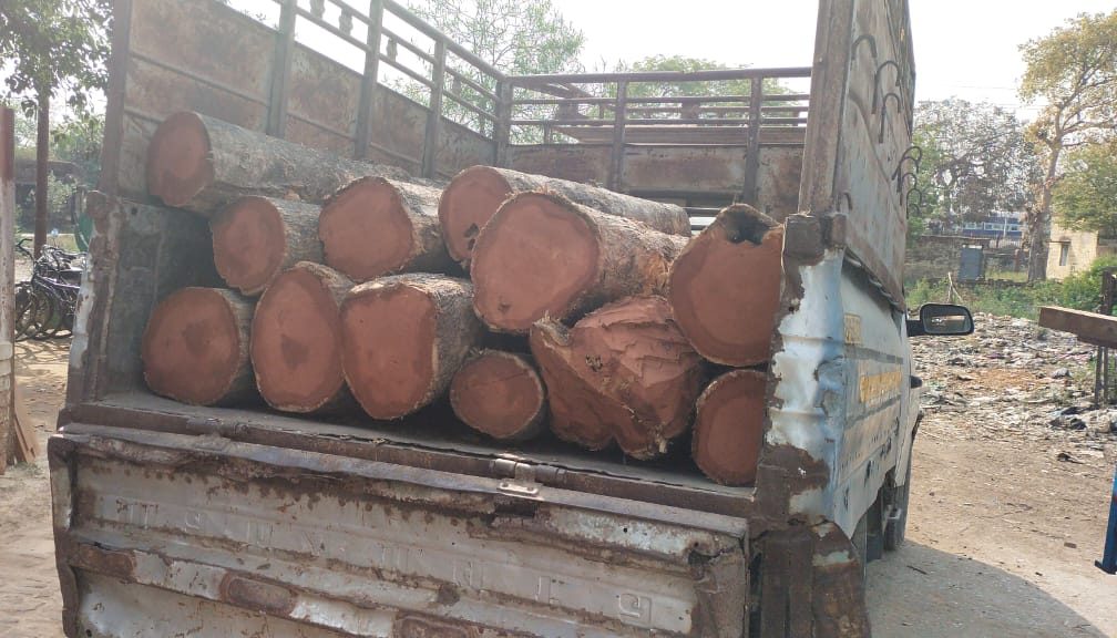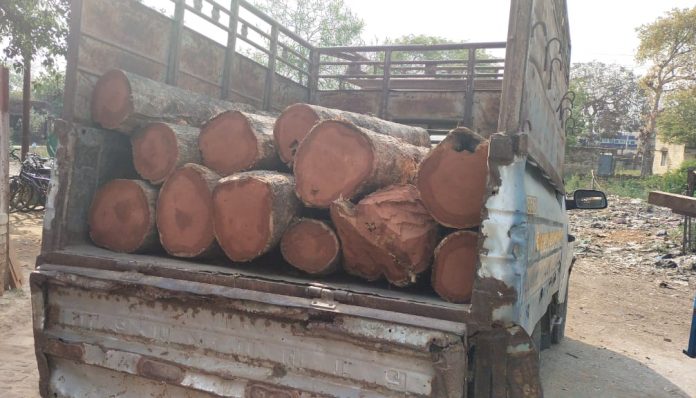 बाजपुर रेलवे क्रॉसिंग के पास पिकअप से अवैध सागोन की लकड़ी बरामद।