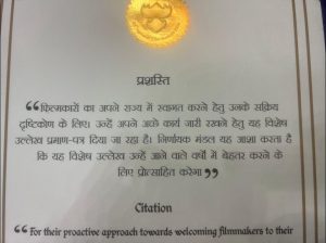 वहीं उन्होंने कहा कि राज्य की मुख्यमंत्री द्वारा फुल उद्योग को प्रोत्साहित करने के लिए महत्वपूर्ण निर्णय लिए गए हैं। उन्होंने कहा कि राज्य सरकार ने फिल्म निर्माता निर्देशक के लिए अनुकूल माहौल बनाया है जिसका परिणाम है कि आज उत्तराखंड को राष्ट्रीय स्तर पर पुरस्कार से सम्मानित किया गया है।