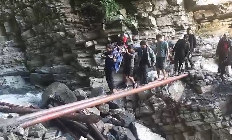 वाण गाँव की एक बीमार महिला को लोगो ने जान जोखिम में डालकर सामुदायिक स्वास्थ्य केंद्र थराली पहुँचाया, जहां महिला का उपचार चल रहा हैं।