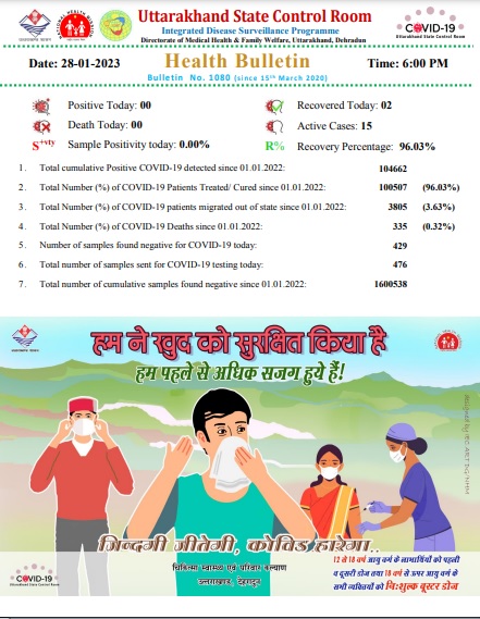 Homeराज्यउत्तराखण्डब्रेकिंग: उत्तराखंड में कोरोना के मामलों में लगा विराम, नहीं मिला आज... बड़ी खबरब्रेकिंग न्यूज़राज्यउत्तराखण्डदेहरादूनसमाचारहेल्थ ब्रेकिंग: उत्तराखंड में कोरोना के मामलों में लगा विराम, नहीं मिला आज एक भी केस। By Vision Desk 3 January 28, 2023 0 157 Share FacebookXPinterestWhatsApp देहरादून – उत्तराखंड में आज नहीं मिला कोरोना का एक भी नया मामला। आज कोई मौत नही हुई है। Tags#covidCovid Acive CaseHealth Bulletintoday's active caseUttarakhand Health Depratmentuttarakhand newsvision2020 news Share FacebookXPinterestWhatsApp Previous articleफर्जी डिग्री वाले मुन्ना भाइयों पर एसटीएफ का शिकंजा, चार फर्जी डॉक्टर को किया गिरफ्तार।Next articleबिग ब्रेकिंग : स्वास्थ्य विभाग के 11 डॉक्टरों को मिली अहम जिम्मेदारी। Vision Desk 3http://vision2020news.com/उत्तराखंड ताज़ा समाचार - Vision 2020 News gives you the Latest News, Breaking News in Hindi.Uttarakhand News, Dehradun News, Latest News, daily news, headlines, sports, entertainment and business from Uttarakhand, India. RELATED ARTICLES उत्तराखण्ड DEHRADUN: सहस्त्रधारा के पास गहरी खाई में गिरा व्यक्ति, SDRF ने चलाया रेस्क्यू ऑपरेशन, शव बरामद April 5, 2026 उत्तराखण्ड दून पुलिस की बड़ी कार्रवाई: 70 लाख के मोबाइल रिकवर, मालिकों को सौंपे April 4, 2026 उत्तराखण्ड मुख्यमंत्री धामी ने केंद्रीय मंत्री मनोहर लाल खट्टर से की मुलाक़ात, हरिद्वार गंगा कॉरिडोर के लिए ₹325 करोड़ का अनुरोध April 4, 2026 LEAVE A REPLY Cancel reply Comment: Please enter your comment! Name:* Please enter your name here Email:* You have entered an incorrect email address! Please enter your email address here Website: Save my name, email, and website in this browser for the next time I comment. Most Popular DEHRADUN: सहस्त्रधारा के पास गहरी खाई में गिरा व्यक्ति, SDRF ने चलाया रेस्क्यू ऑपरेशन, शव बरामद April 5, 2026 दून पुलिस की बड़ी कार्रवाई: 70 लाख के मोबाइल रिकवर, मालिकों को सौंपे April 4, 2026 मुख्यमंत्री धामी ने केंद्रीय मंत्री मनोहर लाल खट्टर से की मुलाक़ात, हरिद्वार गंगा कॉरिडोर के लिए ₹325 करोड़ का अनुरोध April 4, 2026 पुलिस लाइन देहरादून पहुंचे सीएम धामी, प्रशिक्षण ले रहे कांस्टेबलों को किया संबोधित April 4, 2026 Load more Recent Comments https://www.viagrasansordonnancefr.com/acheter-sildenafil-pfizer-generika/ on साइबर ठग ने जब डीएम से पूछा एटीएम कोड…पढ़े खबर Jan Manch TV on अगर है एक रूपए का नोट? तो जाने कैसे बन सकते हैं करोड़पति…!!! Ajit Desai on दिल्ली में अलर्ट, खुरासान गुट के दो आतंकियों के आने का शक! Avidhesh singh on म्यूजिक सुनते हुए वैसी ही खुशी महसूस होती है जैसी सेक्स प्लेजर!