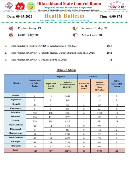 जिसमें अल्मोड़ा में 2, बागेश्वर में 1, चमोली में 4, देहरादून में 6, हरिद्वार में 1 और नैनीताल में 5 मामले मिले है।