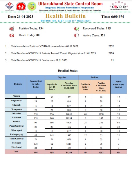 देहरादून – उत्तराखंड में आज कोरोना ले 134 नए मामले मिले है।