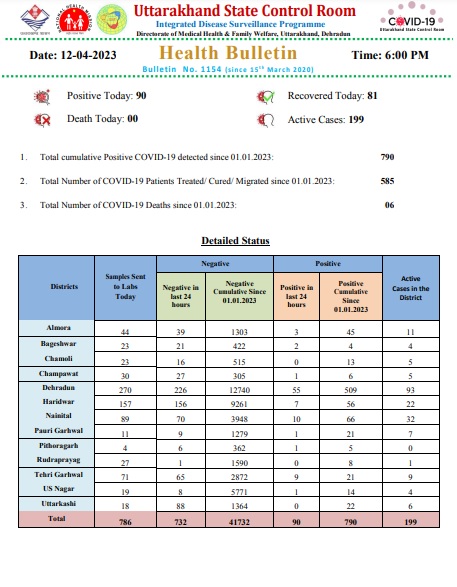 जिसमें अल्मोड़ा में 3, बागेश्वर में 2, चम्पावत में 1, देहरादून में 55, हरिद्वार में 7, नैनीताल में 10, पौड़ी गढ़वाल में 1, पिथौरागढ़ में 1, टिहरी गह्द्वाल में 9 और उधम सिंह नगर में 1 नए मामले मिले है।