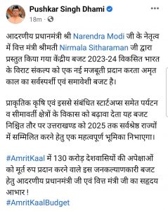 सीएम ने कहा कि अमृत काल में 130 करोड़ देशवासियों की अपेक्षा को मूर्त रूप प्रदान करने वाले इस जनकल्याणकारी बजट के लिए आदरणीय प्रधानमंत्री व वित्त मंत्री निर्मला सीतारमण को सहृदय आभार व्यक्त करना चाहता हूं।