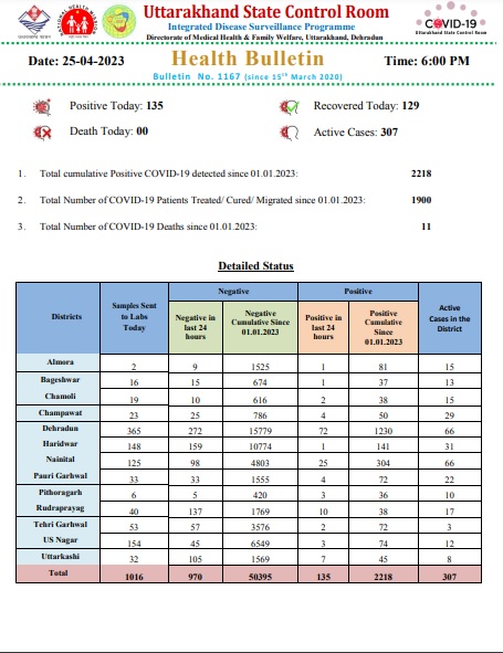 जिसमें अल्मोड़ा में 1, बागेश्वर में 1, चमोली में 2, चम्पावत में 4, देहरादून में 72, हरिद्वार में 1, नैनीताल में 25, पौड़ी गढ़वाल में 4, पिथौरागढ़ में 3, रुद्रप्रयाग में 10, टिहरी गढ़वाल में 2, उधम सिंह नगर में 3 और उत्तरकाशी में 7 नए मामले मिले है।